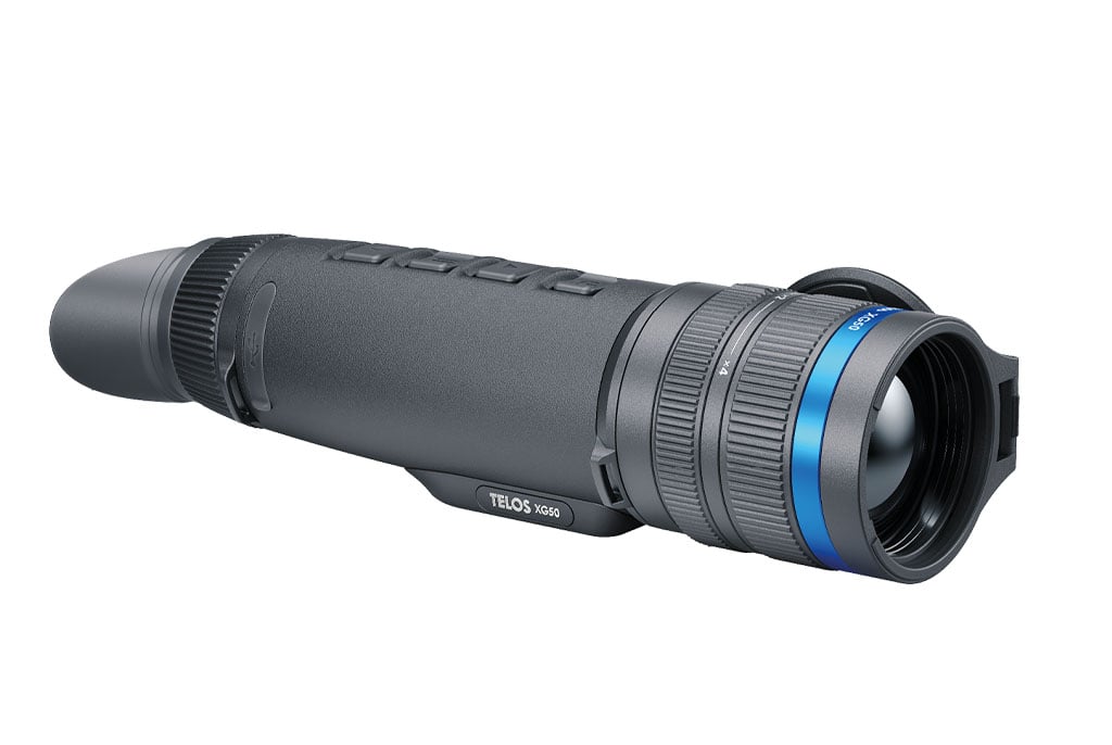 The design of the Pulsar Telos XG50 thermal monocular is completely new. This features a rubberized magnesium body, a 12 micron 640 resolution sensor with a detection range of 2300m, a proximity sensor, a smooth rotating digital zoom, and wireless charging.
